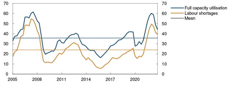 4 Period: 2005 Q1 – 2022 Q4. Share of contacts that will face some or considerable difficulty meeting increased demand and share of contacts citing labour shortages as a constraint on production. The question about labour is asked only of the enterprises reporting full capacity utilisation, but the series shows the share of all contacts included in the interview period. The local government and hospital sector is omitted from the capacity utilisation series, but is, however, included in the labour force series.