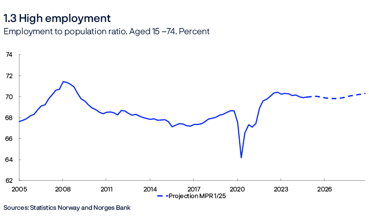 Economic growth in Norway is projected to pick up ahead, with an increase in household demand providing the main impetus to growth. Wages rose significantly faster than prices in 2024, and real growth in wages is also expected ahead. In addition, a lower policy rate further out will reduce household interest expenses. In 2024, households saved a large share of their increased income, but the saving ratio is projected to be more stable between 2024 and 2025, with a pickup in consumption growth.