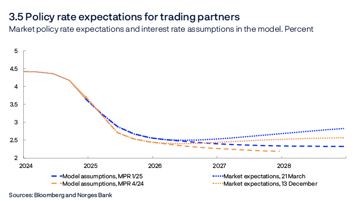 GDP growth among trading partners is projected to increase slightly in 2025 and 2026 and is expected to stimulate the Norwegian economy. At the same time, the projections for 2025 are somewhat lower than in the previous Report. The projections are based on the following: