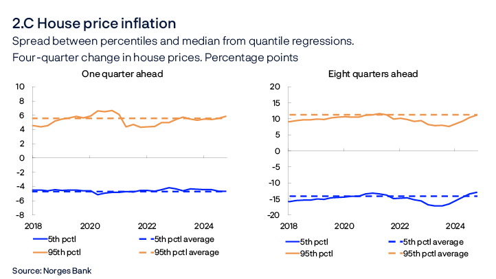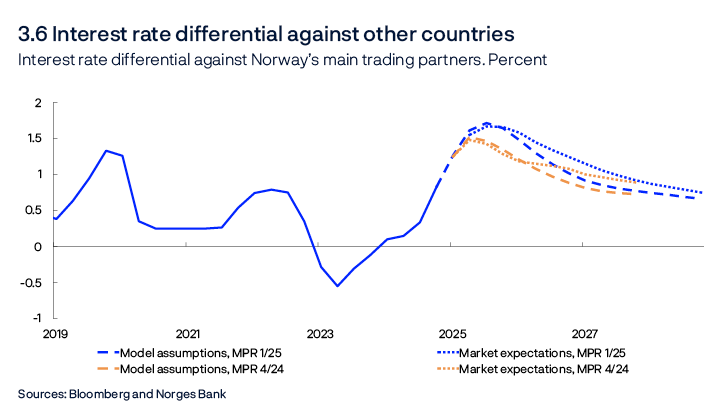 There is a clear risk of more extensive trade restrictions than assumed, which may result in lower international economic activity than projected, which alone would dampen domestic activity. If a large share of exports to the EU – by far Norway’s largest trading partner – were to be subject to tariffs, the effects on the Norwegian economy could be particularly negative. The impact of higher tariffs on domestic inflation is uncertain. On the one hand, lower activity could dampen inflation. On the other hand, higher tariffs alone could push up inflation in countries that implement tariffs, which could in turn result in higher inflation for goods imported to Norway from these countries. Trade policy turbulence could also affect foreign exchange markets, which in turn could influence inflation in Norway.