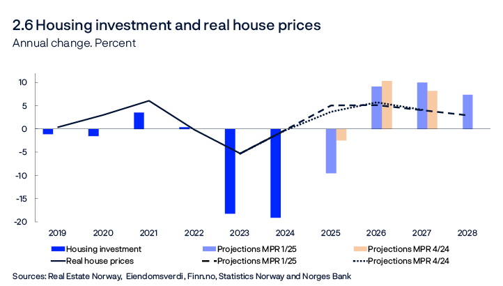 According to national accounts data, economic activity fell towards the end of 2024, and the Committee noted a further fall in housing investment. On the other hand, employment has risen further, and unemployment has shown a small decline. House prices have increased more than expected, and Norges Bank’s Regional Network contacts report increased activity over winter.