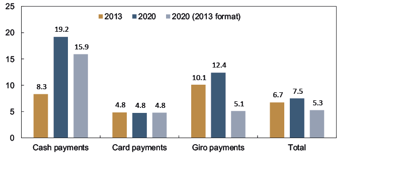 The 2013 costs survey measured fewer elements of businesses’ giro payment costs. In 2013, giro payment costs consisted of the fees businesses pay to banks and businesses’ time consumption, which was set at 60 seconds per giro payment. The current survey measures both the cost for businesses of issuing invoices and the cost of paying invoices. Chart A3.16 compares the costs of giro payments, and we show figures for 2020 based on the methodology of the 2013 survey (orange bar) and the figures for 2013 adjusted for the price level between 2013 and 2020 (purple bar), as well as businesses’ costs related to paying invoices as they are now calculated (blue bar).