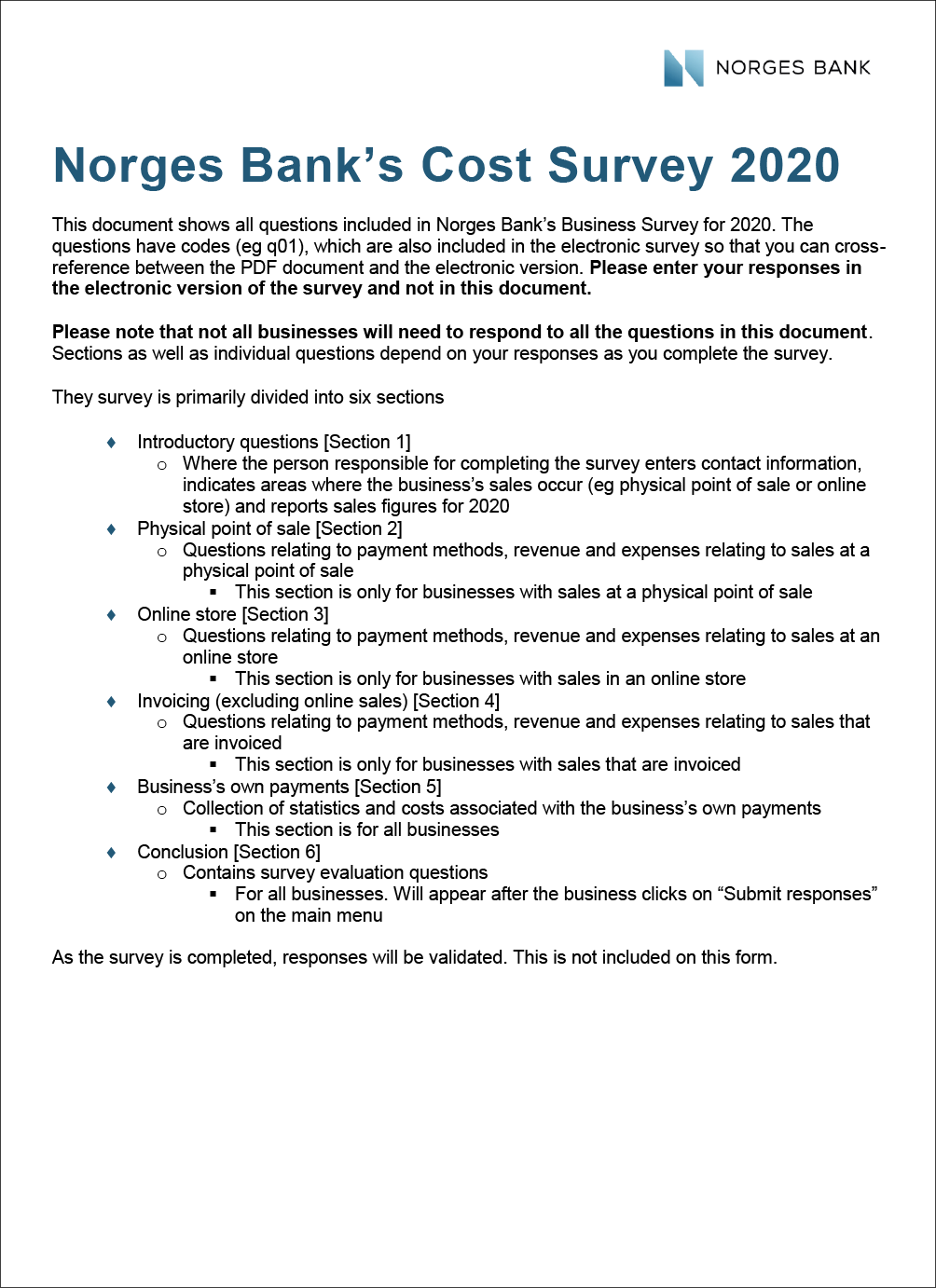 The survey focuses on domestic payments made by households, businesses and the public sector. The analysis does not cover bank-to-bank payments, Norwegians’ use of payment services abroad, foreigners’ use of payment services in Norway or cross-border online purchases. Payments using cheques, fuel cards, e-money and crypto-assets are also excluded. The volume of such payments in Norway is likely relatively limited.