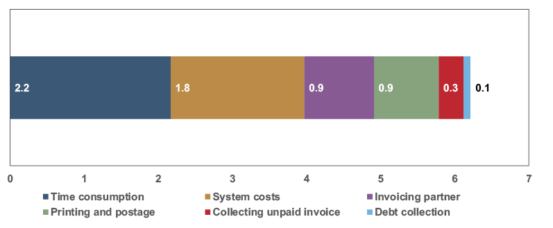 The unit costs for an invoice are NOK 6.2 and comprise time spent (NOK 2.2), system costs (NOK 1.8), expenses for the invoicing partner (NOK 0.9), printing and postage of physical invoices (NOK 0.9), expenses for collecting an unpaid invoice (NOK 0.3) and debt collection costs (NOK 0.1) (Chart A3.10).