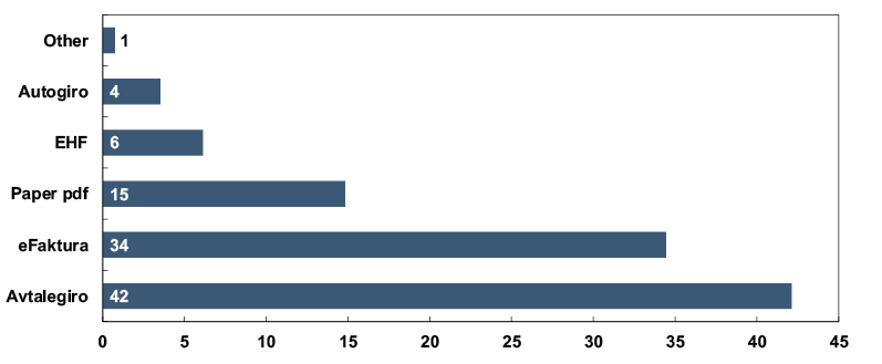 In 2020, the 42 businesses that bill their customers collected payment via 101 million invoices and direct debits, of which 86 million were e-invoices and direct debits. Of the 86 million, 42 million were direct debits (including combination products such as Avtalegiro (direct debit for households) combined with eFaktura (e-invoice)), 34 million were eFaktura invoices, 6 million were EHF invoices and 4 million were Autogiro (direct debit for businesses). The businesses issued 15 million invoices on paper or as email attachments (15 percent of the total number of invoices issued) (Chart A3.11).