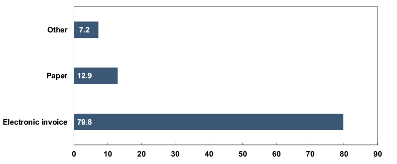 The businesses mainly received e-invoices. Of their total payments, about 80 percent were e-invoice payments (eg Autogiro, EHF and EDIFACT). About 13 percent of the payments originated from an invoice sent on paper or as an email attachment, while 7.2 percent did not originate from an invoice (Chart A3.13).