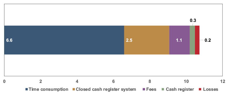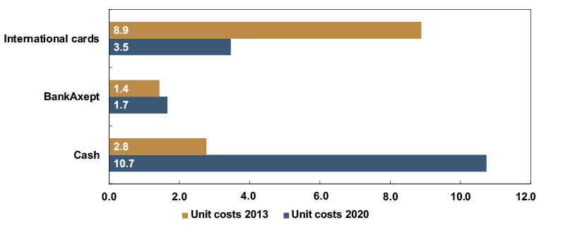 One of the main reasons for the increase in businesses’ unit costs for cash payments is the considerable reduction in the number of cash payments since 2013. Cash payment costs are mainly fixed costs that must be paid regardless of the number of cash payments the business receives (safe depreciation costs, costs related to a closed cash register system, time spent on reconciling and closing cash registers etc.). These fixed costs are now spread across far fewer payments.