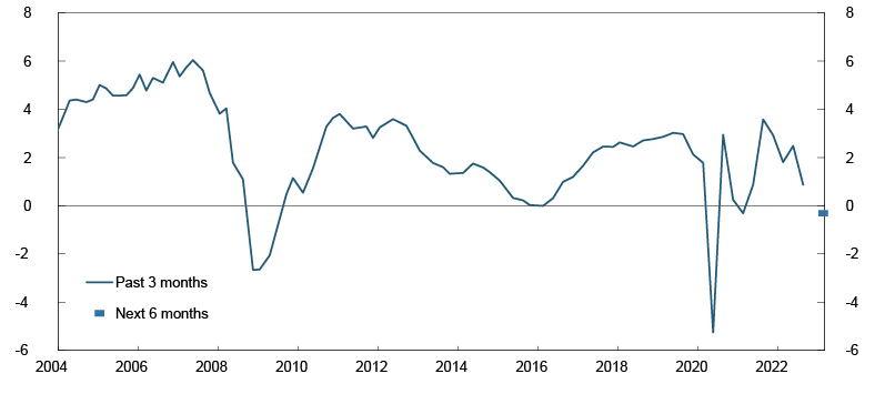 Chart 6. Employment growth Growth past three months and expected growth next three months. Seasonally adjusted. Percent