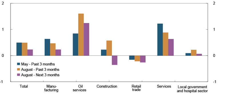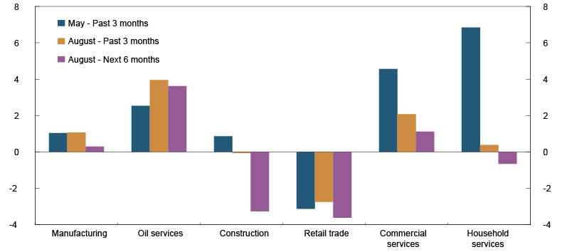 In non-oil manufacturing, growth is slowing, and contacts expect low growth ahead. Developments are weakest in the domestic market, and domestically-oriented manufacturing expects reduced output over the next six months. The building materials industry and the food industry continue to report a reversal of the high demand during the pandemic. In the export industry, growth picked up this summer and contacts expect growth to remain buoyant in the coming period. Fish and seafood industry contacts report increased demand and have had favourable production conditions this summer.