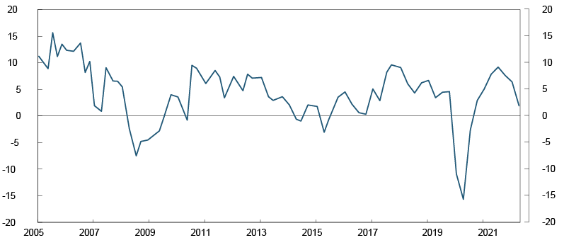 Turnover volume in retail trade has declined further through summer, and the decline is approximately as expected in May. Many retail trade enterprises nevertheless report higher sales in summer than in the pre-pandemic period, but only a few report higher sales volumes in the recent period. Retail segments such as the grocery trade, building materials, furniture and sporting goods report the sharpest declines in sales volumes. On the other hand, turnover in clothing and shoes has risen. Contacts expect that turnover volume in retail trade will continue to fall, citing a sharp rise in prices and higher interest rates and an increase in cross-border shopping by households.