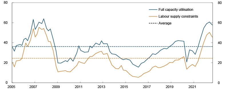 Chart 4. Capacity utilisation1 and labour supply constraints2 Percentage shares