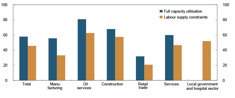 Fewer contacts report recruitment difficulties than in May, but challenges remain widespread in most industries. Labour shortages are the most critical in oil service and construction enterprises, even though the share has fallen slightly in construction.