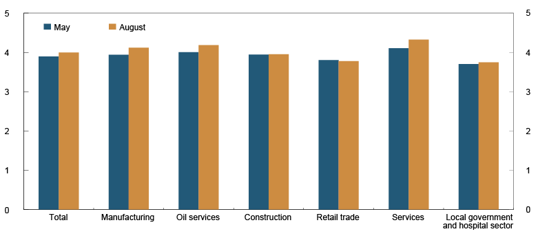 Profitability among contacts is slightly lower than a year ago. A number of contacts in the regions of southern Norway point in particular to higher electricity costs. Profitability developments have been somewhat better in northern Norway, where electricity prices have been lower. Retail trade contacts report the most pronounced decline in profitability, which largely reflects the unusually profitable summer one year ago for a large number of retail enterprises.