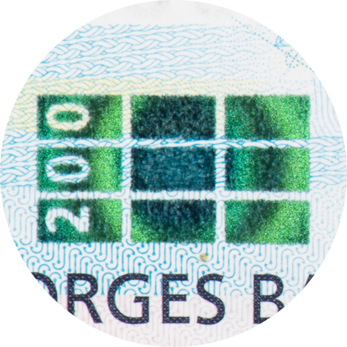 At the right side of the banknote you can see three segments of an anchor chain integrated into the paper. When you tilt the note back and forth, the chain appears to move or run out. The chain is featured on all the denominations except the 50-krone note. See video