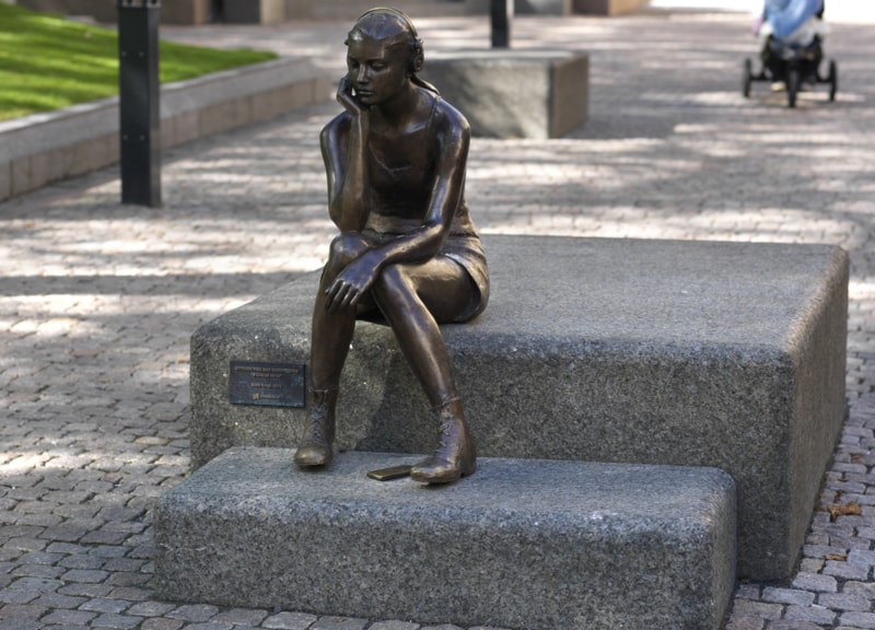 "Sittende pike med hodetelefon - et bilde på vår tid" av Marit Krogh er plassert på en av flere granittblokker som kan fungere som sitteplasser på Bankplassen. Blokkene tjener som sjikaner hvor kjøretøy må redusere hastigheten og derfor representerer en mindre fare ved et angrep rettet mot Norges Bank. (Foto: Esten Borgos)