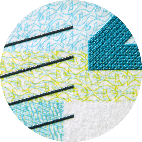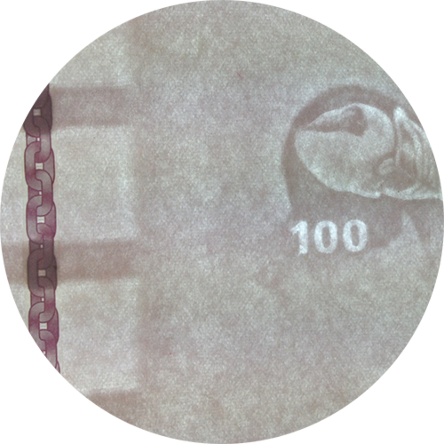 Nede til venstre på seddelen kan du se et rektangel med en ring. Når du beveger seddelen i ulike retninger, ser det ut som ringen flyter, og du kan se et fargespill. Se video