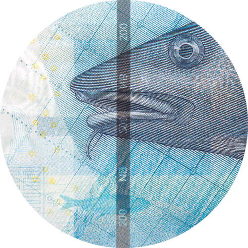 Hovedmotivet på 200-kroneseddelen er en torsk. I bakgrunnen ses sild og notmasker. Fiske har i århundrer vært en sentral del av inntektsgrunnlag og kultur langs norskekysten.