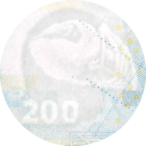 Vannmerket i papiret blir synlig når du holder seddelen opp mot lyset. Vannmerket viser hodet på en lundefugl og valørtallet 200. Lundefuglmotivet benyttes på samtlige valører.