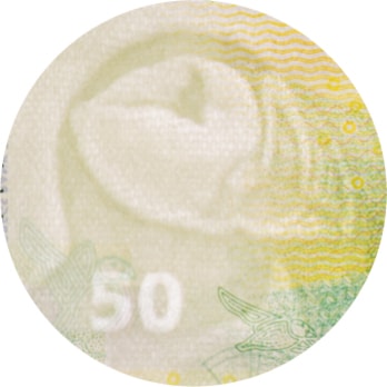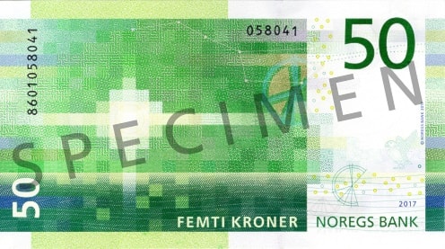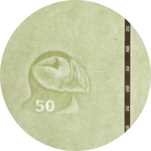 Vannmerket i papiret blir synlig når du holder seddelen opp mot lyset. Vannmerket viser hodet på en lundefugl og valørtallet 50. Lundefuglmotivet benyttes på samtlige valører.