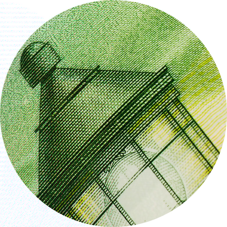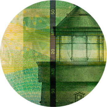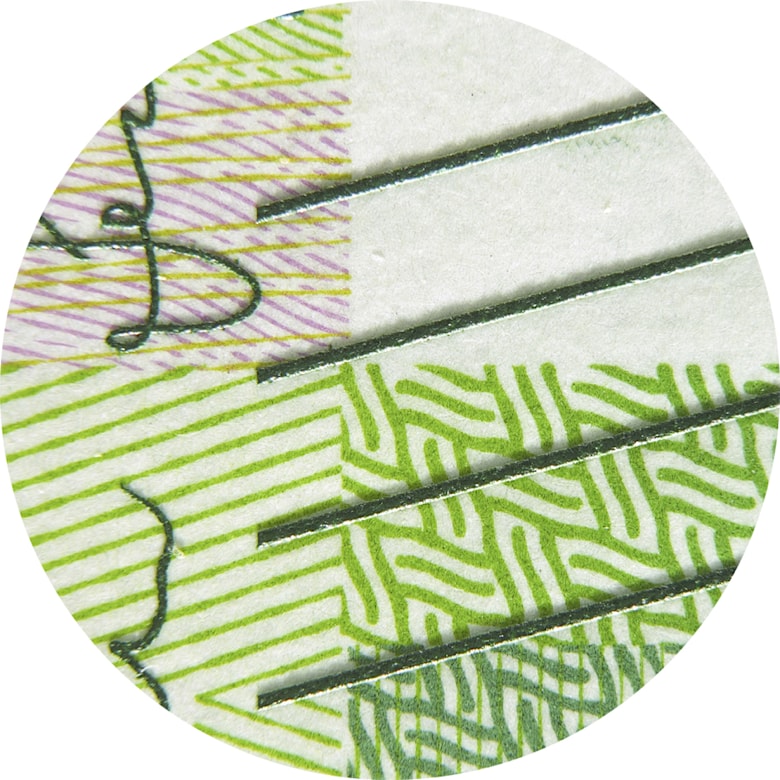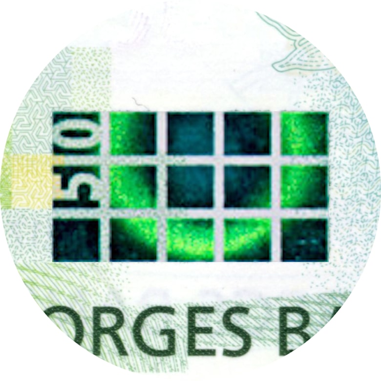 Nede til venstre på seddelen kan du se et rektangel med en ring. Når du beveger seddelen i ulike retninger, ser det ut som ringen flyter, og du kan se et fargespill.