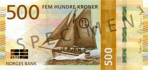Hovedmotivet på 500-kroneseddelen er redningsskøyta RS 14 «Stavanger», designet av Norges mest kjente båtbygger og konstruktør Colin Archer.
