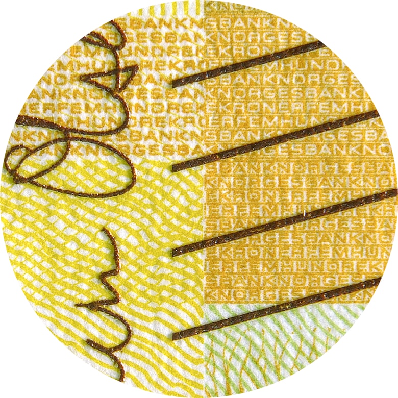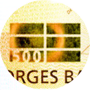 Nede til venstre på seddelen kan du se et rektangel med en ring. Når du beveger seddelen i ulike retninger, ser det ut som ringen flyter, og du kan se et fargespill.