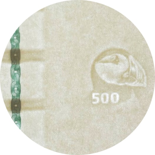 Vannmerket i papiret blir synlig når du holder seddelen opp mot lyset. Vannmerket viser hodet på en lundefugl og valørtallet 500. Lundefuglmotivet benyttes på samtlige valører.