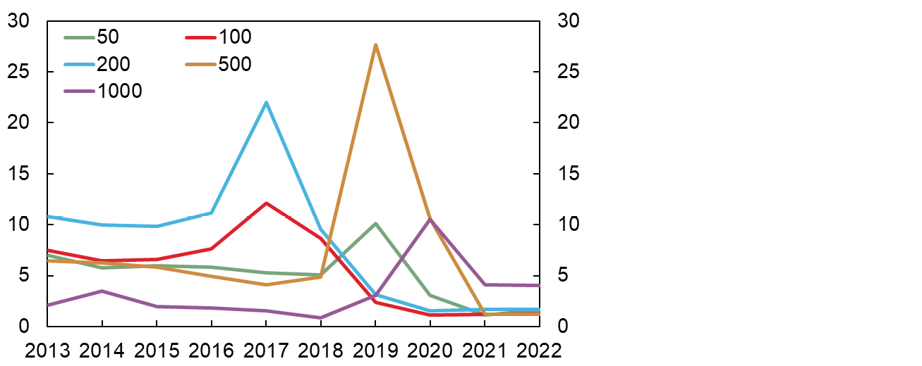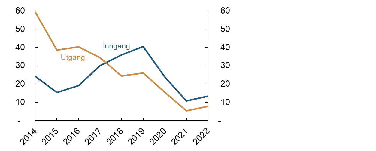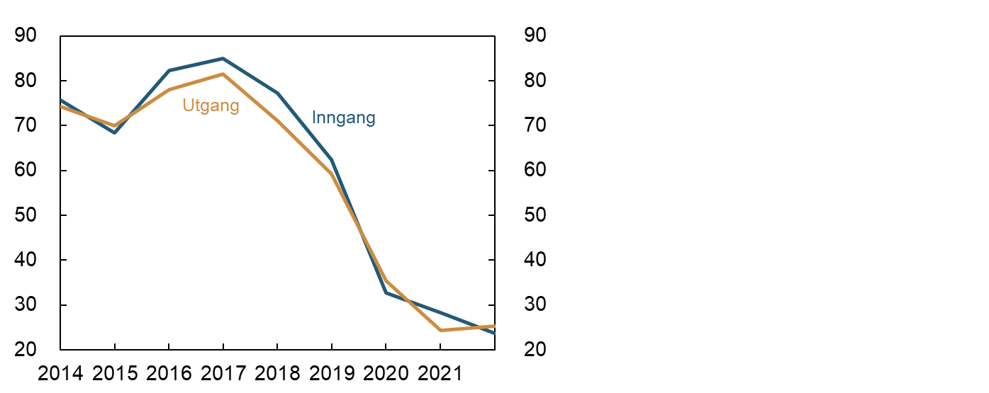 Ein noko høgare inngang (innskot) og utgang (uttak) av setlar i åra 2016, 2017 og 2018, illustrert i figur 8, er truleg knytt til utskiftinga av setelrekkja. Dei neste åra har seteltransaksjonane med Noregs Bank halde fram med å falle.