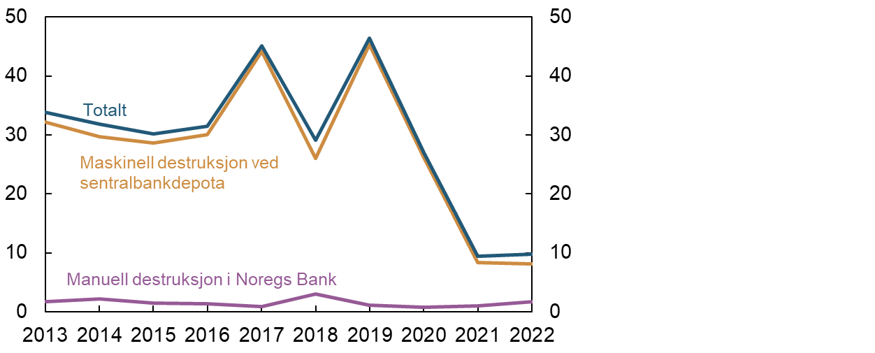 I 2022 blei det destruert 9,8 millionar setlar som hadde vore i sirkulasjon, tilsvarande 5,2 milliardar kroner, jf. figur 10. Året før var det tilsvarande talet 9,4 millionar setlar, også det tilsvarande 5,2 milliardar kroner. Toppane i 2017 og 2019 har samanheng med tilbaketrekkinga av den gamle setelutgåva. Det låge nivået i 2021 og 2022 kjem av at setlane i omløp er relativt nye og derfor lite slitne, men òg av lågare kontantsirkulasjon.