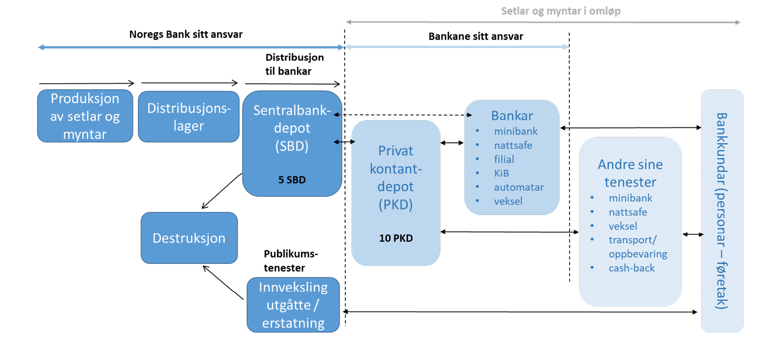 Noregs Bank har ei grossistrolle i kontantforsyninga. Som illustrert i figur 1 nedanfor set Noregs Bank setlar og myntar i sirkulasjon ved å forsyne bankane med kontantar frå fem sentralbankdepot. Slitne setlar og myntar blir destruerte av Noregs Bank i Oslo. Utgåver av setlar og myntar som ikkje lenger er tvungne betalingsmiddel, kan etter nærmare reglar innløysast direkte i Noregs Bank.