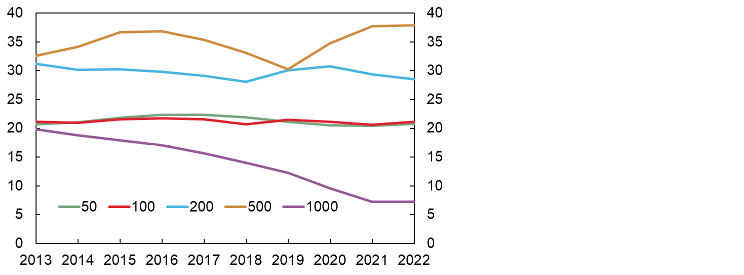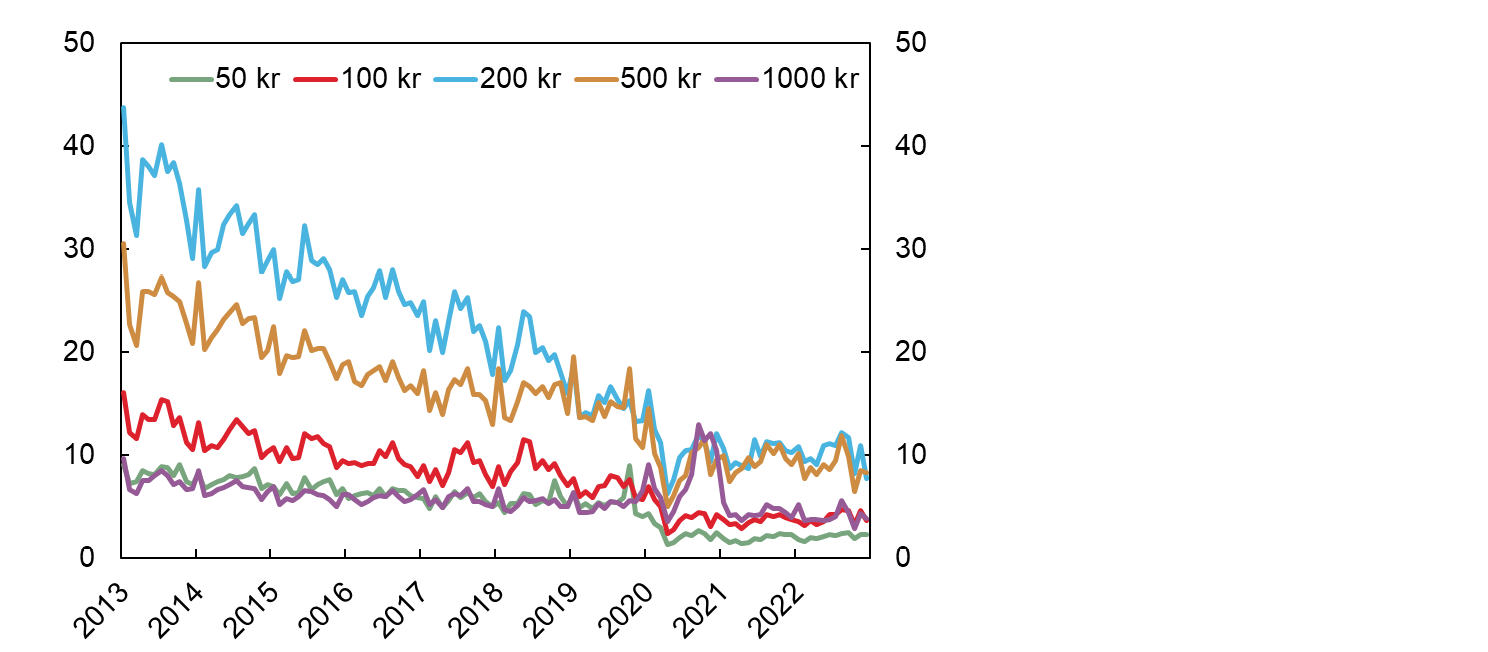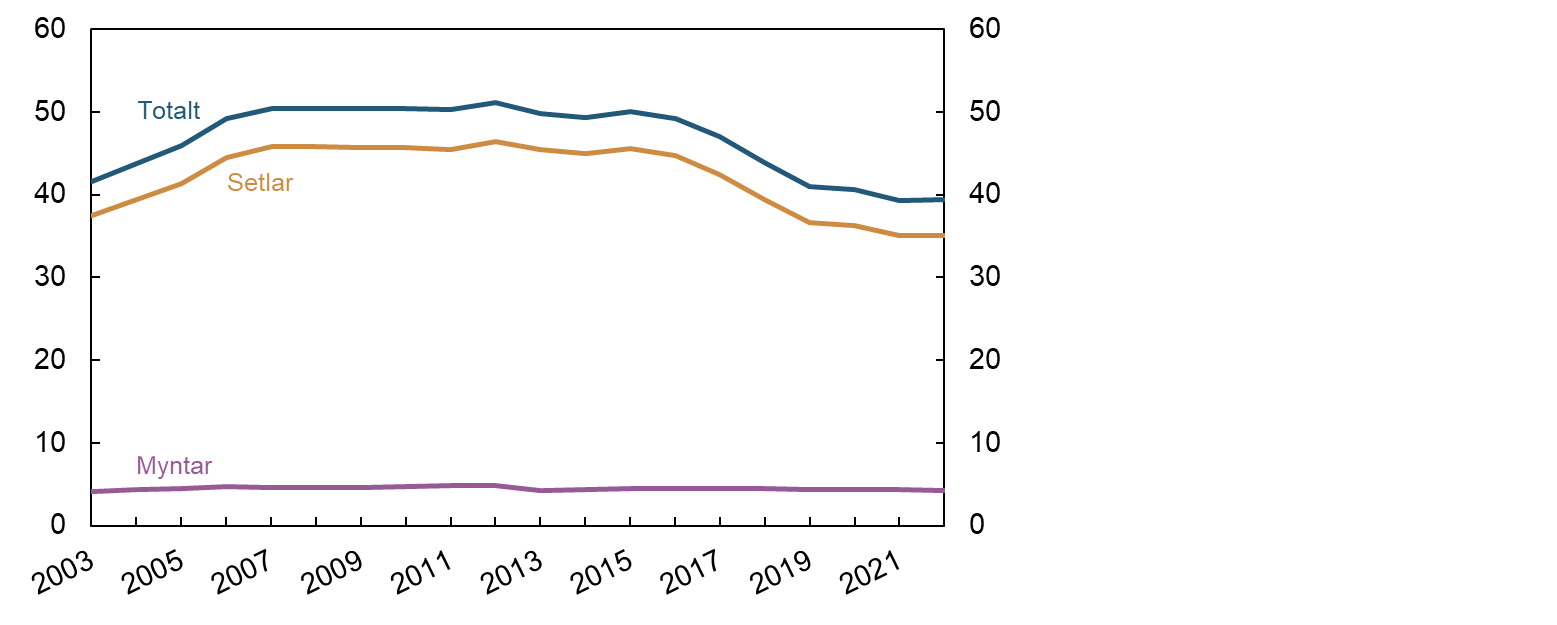 Figur 33 viser endringar i samansetjinga av dei ulike setelvalørane dei siste ti åra. Valørsamansetjinga blir mellom anna påverka av kva valørar som blir nytta i minibankane. Endringane har vore små det siste året. I 2022 var det i gjennomsnitt 115,7 millionar setlar i omløp, ein auke på 0,3 prosent frå 2021. Etter fleire år med stor nedgang i talet på 1000-kronesetlar i omløp auka talet med 1 prosent i 2022. 500-kronesetelen har hatt ein auke dei tre siste åra etter ein nedgang dei tre føregåande åra og auka med 0,5 prosent i 2022. 200-kronesetelen har gått ned med 2,8 prosent. 100- og 50-kronesetlane har hatt ein auke i 2022 på høvesvis 1,8 og 2,5 prosent.