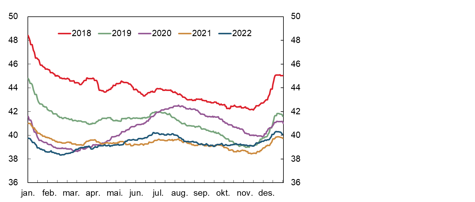 Det er typiske sesongsvingingar i kontantomløpet gjennom året med ein topp i samband med jula, sjå figur 4. Elles er det mindre toppar i omløpet ved påsketider og om sommaren. I første halvår av 2020 såg vi ei uvanleg utvikling i form av ein auke frå koronautbrotet i mars og med ein topp i året på 42,5 milliardar i august. I 2021 og 2022 var sesongsvingingane svakare enn tidlegare.