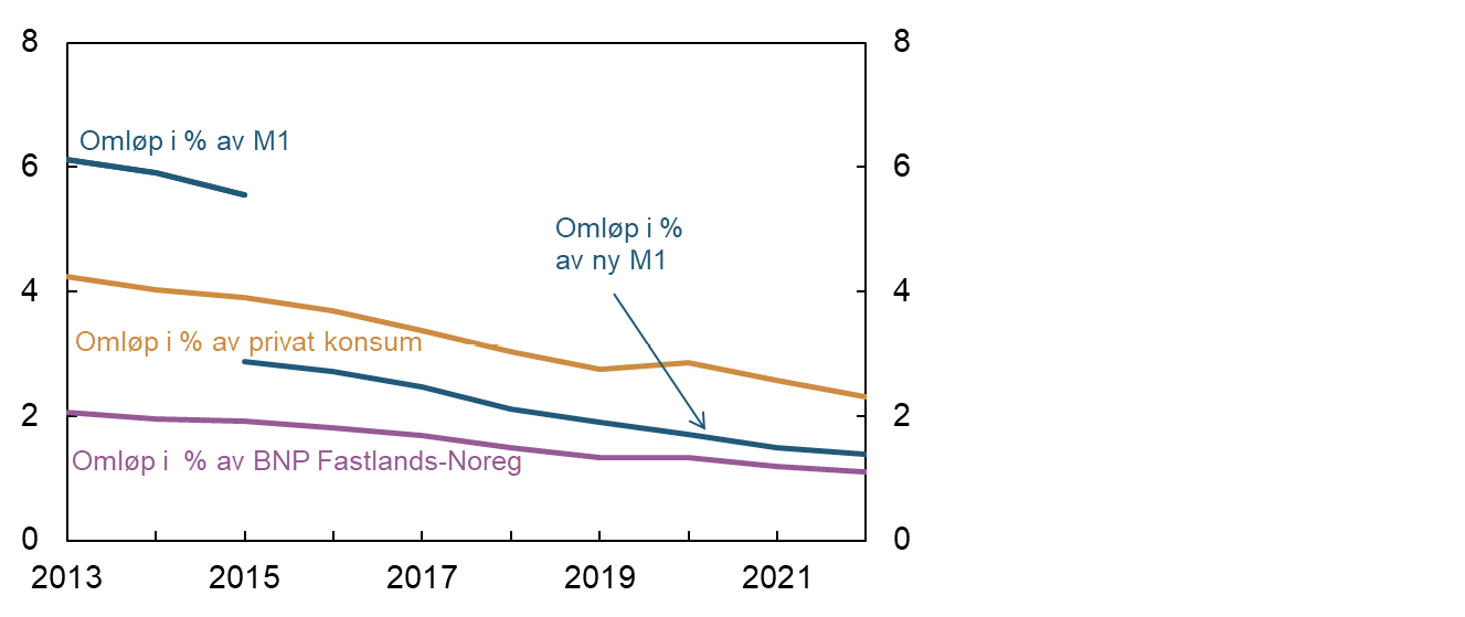 Kontantdelen av verdien av betalingsmiddel som publikum disponerer (M1), held fram med å falle, jf. figur 5. I 2015 la SSB om pengemengdstatistikken, og behaldningar frå periodar før april 2015 kan ikkje samanliknast med nyare periodar. Pengemengdstatistikken følgjer no ECB-definisjonen av pengemengda. I 2022 utgjorde kontantdelen av M1 1,4 prosent. Det er svært lågt samanlikna med dei fleste andre land vi har statistikk frå.