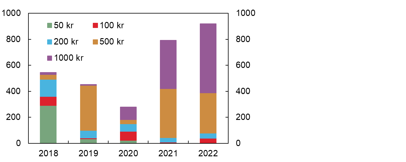Til saman hadde bankane 17 prosent færre seteltransaksjonar med Noregs Bank i 2022 enn i 2021, mens snittbeløpet per transaksjon har auka med 4 prosent. Det var samla sett ein netto utgang av setlar i 2022, det vil seie ein auke i antal setlar i omløp, på 1,5 millionar, jf. figur 6. (Merk at dette viser endringa frå byrjinga til slutten av året, derfor avvik talet frå endringa i årsgjennomsnittet, jf. 3.1.) Alle valørar, bortsett frå 200-kronesetelen, hadde netto utgang gjennom 2022.